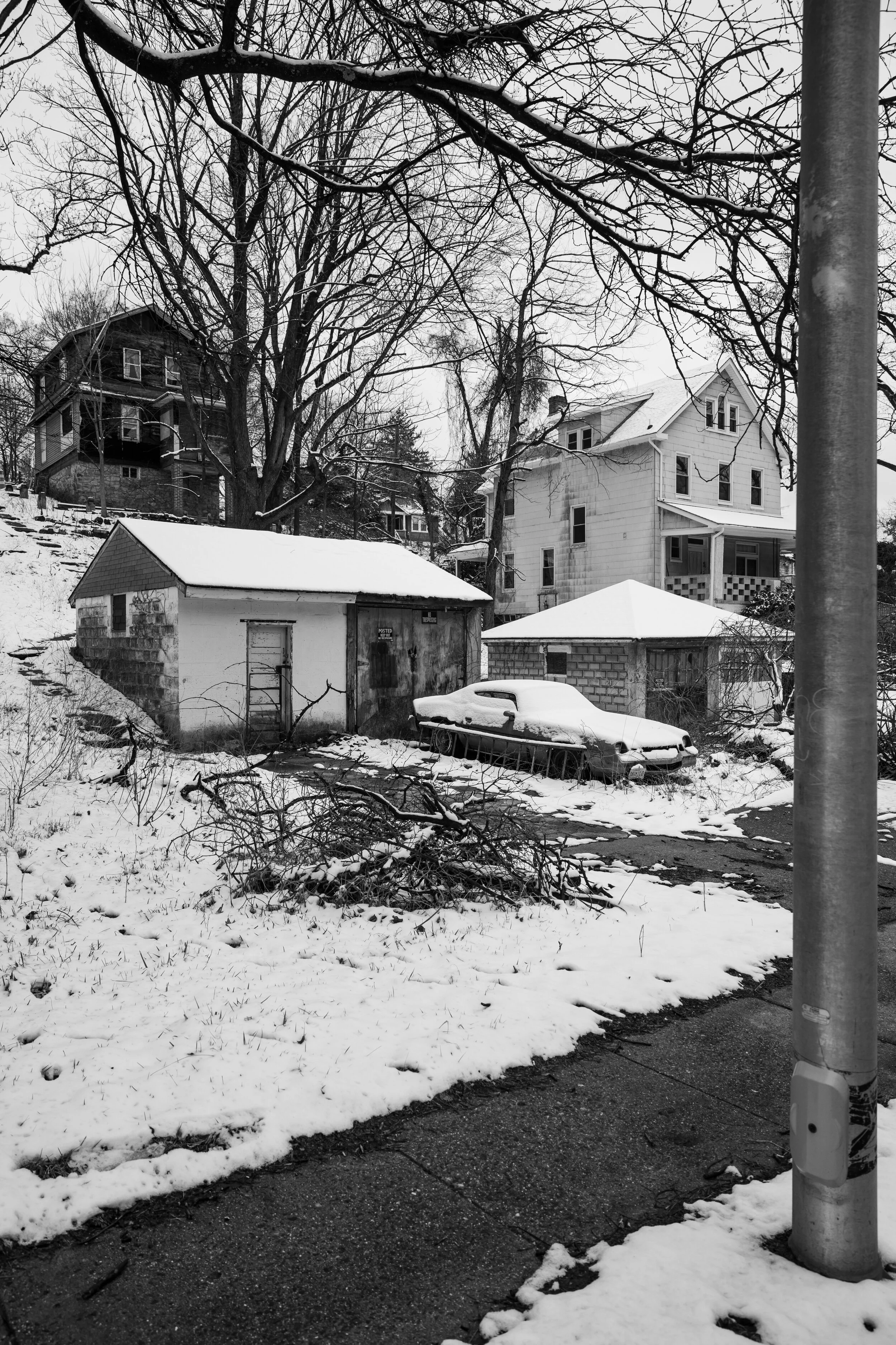 Black and white photo of a snowy residential scene with a small garage, an abandoned car, and multiple houses in the background, with leafless trees and a sidewalk. View fullsize